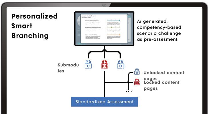 Turn one-size-fits-all into just-right learning. Start with an AI-generated, competency-based pre-assessment (scenario + rubric). Based on results, learners skip what they’ve mastered and focus on the gaps yet still face a mandatory end-of-submodule assessment to prove mastery. All inside your existing LMS, no rebuilds.